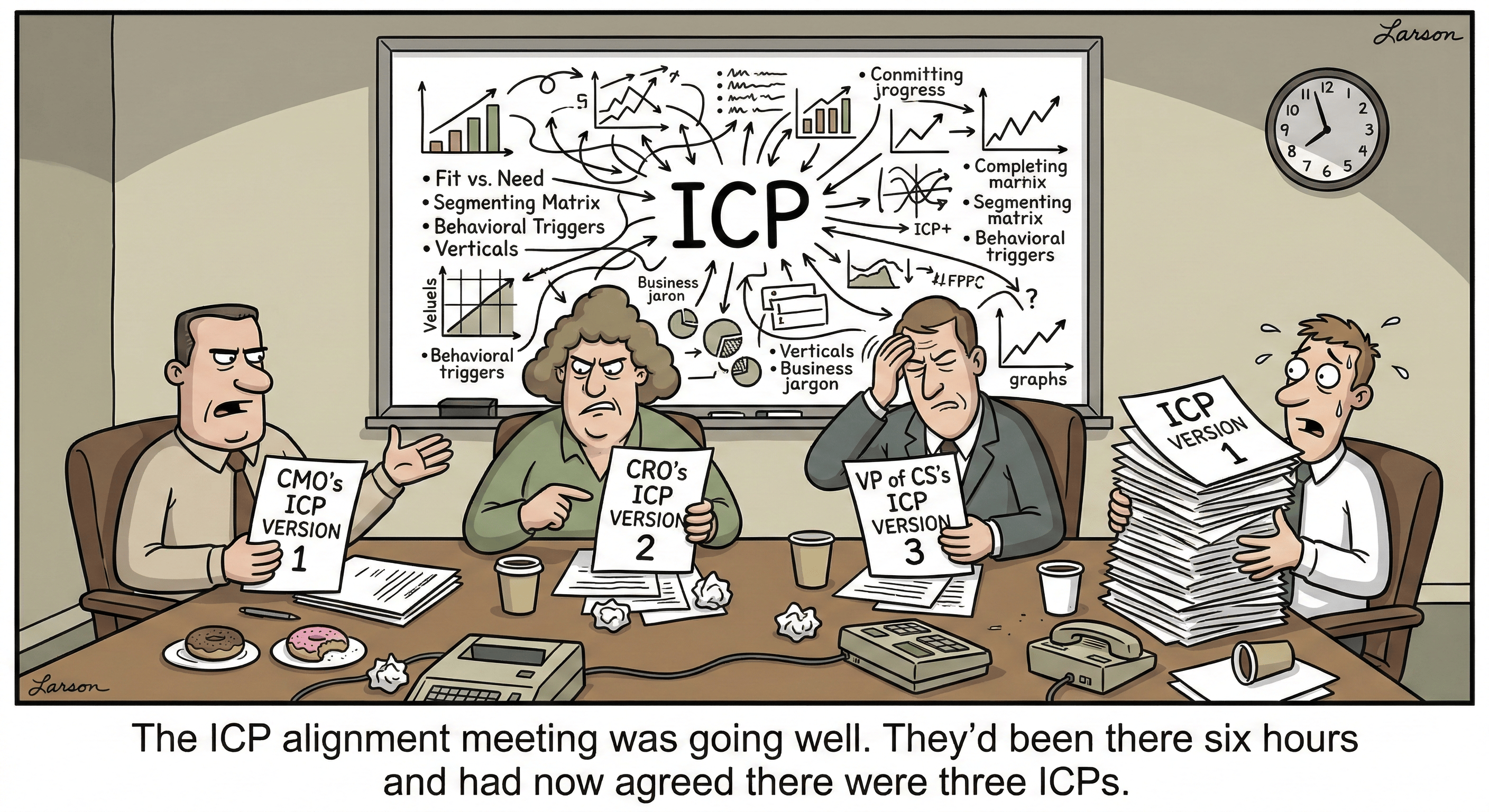 I've walked into revenue rooms where the CMO's ICP, the CRO's ICP, and the VP of CS's ICP were three different documents describing three different types of companies. Marketing was targeting by industry and size. Sales was qualifying by deal size and decision-maker title. CS was segmenting by implementation complexity. All three were reasonable approaches. None of them were talking to each other.